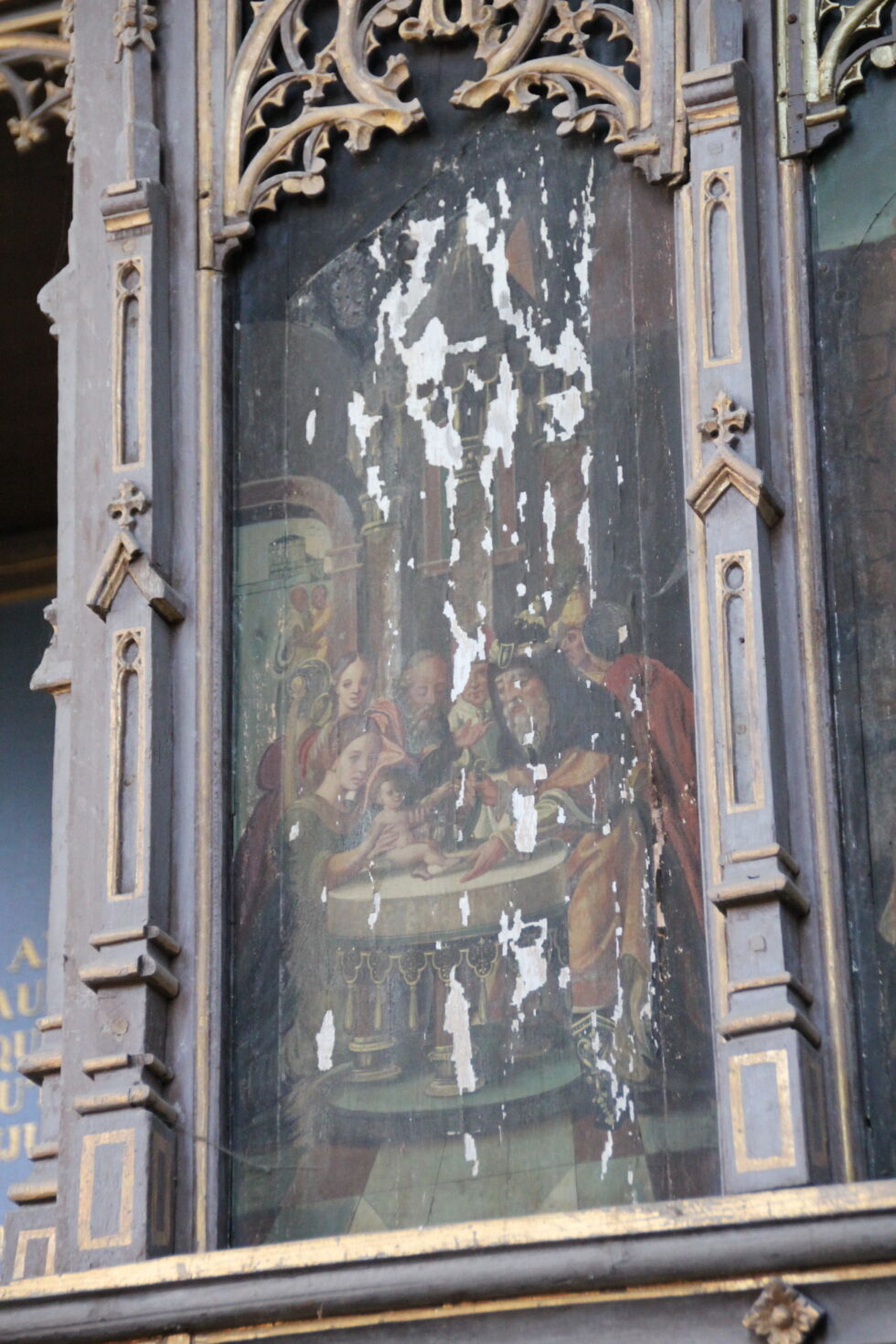 Voici trente ans que la chapelle castrale d’Enghien est privée de ses quatre vitraux, actuellement déposés et conservés dans des caisses, dans le nouveau château d’Enghien. Trois d’entre eux datent du XVIe siècle et proviennent de l’église de Dion-le-Val, tandis que le quatrième fut créé au XIXe siècle pour compléter l’ensemble. Sur la base d’anciennes études préalables qui devraient être actualisées et après restauration, les quatre vitraux pourraient rendre tout son éclat à l’intérieur de la chapelle médiévale grâce à leurs effets de lumière chatoyants. D’autres œuvres qui attendent également une prise en charge contribueraient elles-aussi à réintroduire une atmosphère colorée dans la chapelle. Les dix-huit panneaux peints qui ornent le jubé sont aujourd’hui ternis par une épaisse couche de poussière. Il s’agit d’œuvres d’artistes demeurés anonymes des XVIe et XVIIe siècles des Pays-Bas méridionaux, regroupées sans aucune unité iconographique et, pour la plupart, réduites ou agrandies pour intégrer les lambris. Leur état dégradé nécessite une restauration complexe, car la peinture s’écaille et les vernis jaunissent. Enfin, le pavement de terre cuite jaune et noir du XVIe ou XVIIe siècle du sol autour de l’autel est partiellement décoloré, mais il est heureusement demeuré intact.